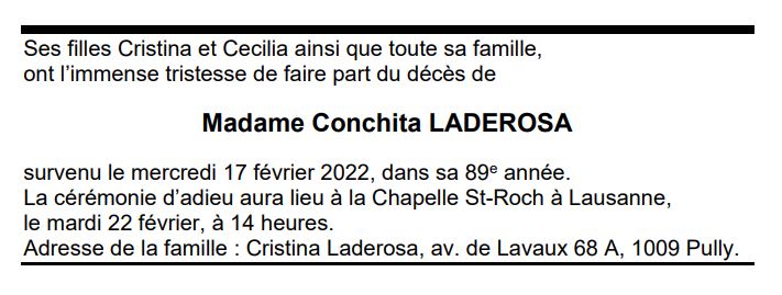 Madame Conchita LADEROSA 22 juil. 1933 - 17 fév. 2022 Avis mortuaire PFG Télecharger PDF Partager sur: Galerie PreviousNext PreviousNext