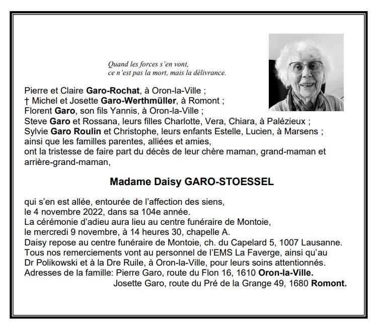 Madame Daisy GARO-STOESSEL 22 mai. 1919 - 04 nov. 2022 Avis mortuaire PFG Télecharger PDF Partager sur: Galerie PreviousNext PreviousNext