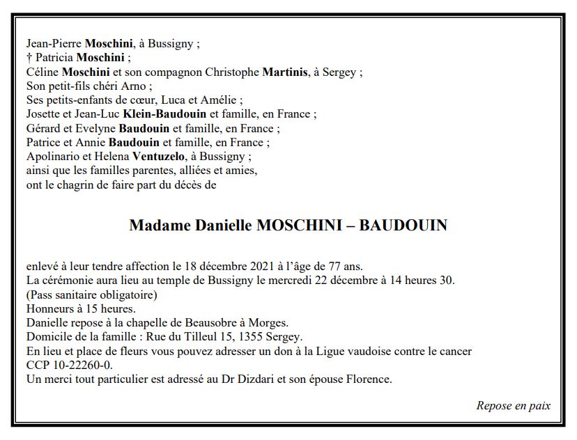 Madame Danielle MOSCHINI – BAUDOUIN 30 nov. 1944 - 18 déc. 2021 Avis mortuaire PFG Télecharger PDF Partager sur: Galerie PreviousNext PreviousNext