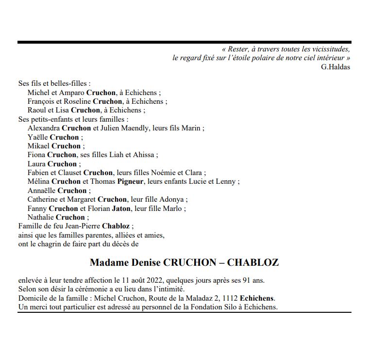 Madame Denise CRUCHON – CHABLOZ 30 juil. 1931 - 11 aoû. 2022 Avis mortuaire PFG Télecharger PDF Partager sur: Galerie PreviousNext PreviousNext