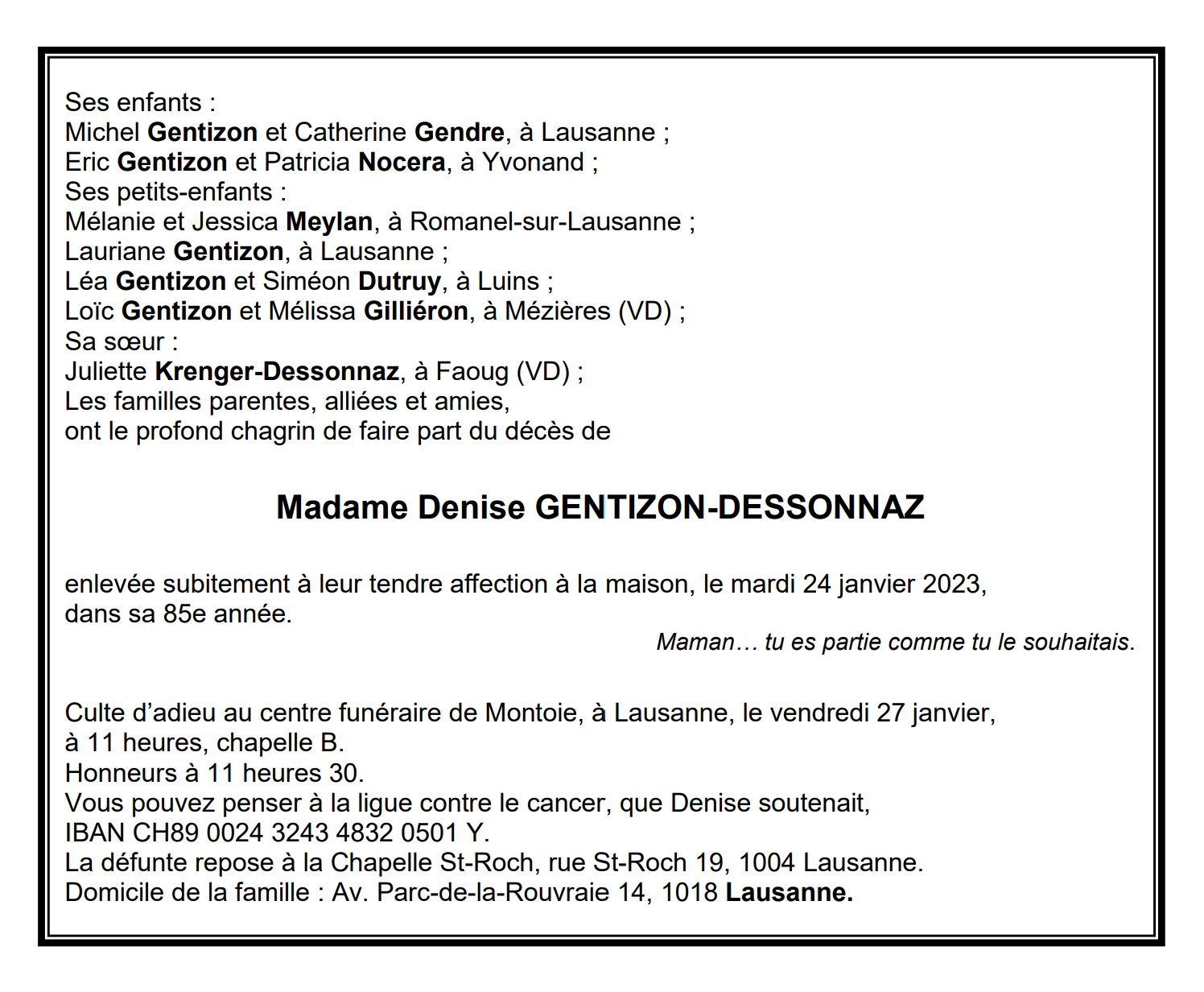 Madame Denise GENTIZON-DESSONNAZ 17 nov. 1938 - 24 jan. 2023 Avis mortuaire PFG Télecharger PDF Partager sur: Galerie PreviousNext PreviousNext