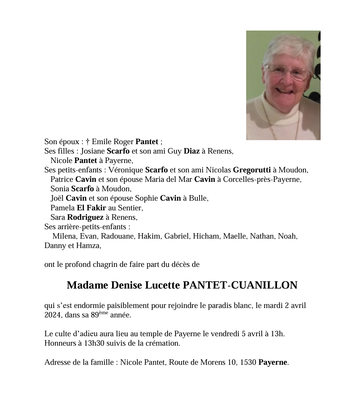 Madame Denise Lucette PANTET-CUANILLON 17 juin. 1935 - 02 avr. 2024 Avis mortuaire PFG Télecharger PDF Partager sur: Galerie PreviousNext PreviousNext