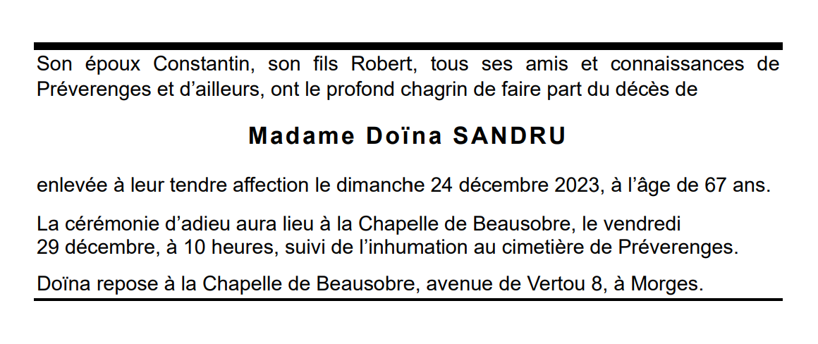 Madame Doïna SANDRU 21 fév. 1956 - 24 déc. 2023 Avis mortuaire PFG Télecharger PDF Partager sur: Galerie PreviousNext PreviousNext