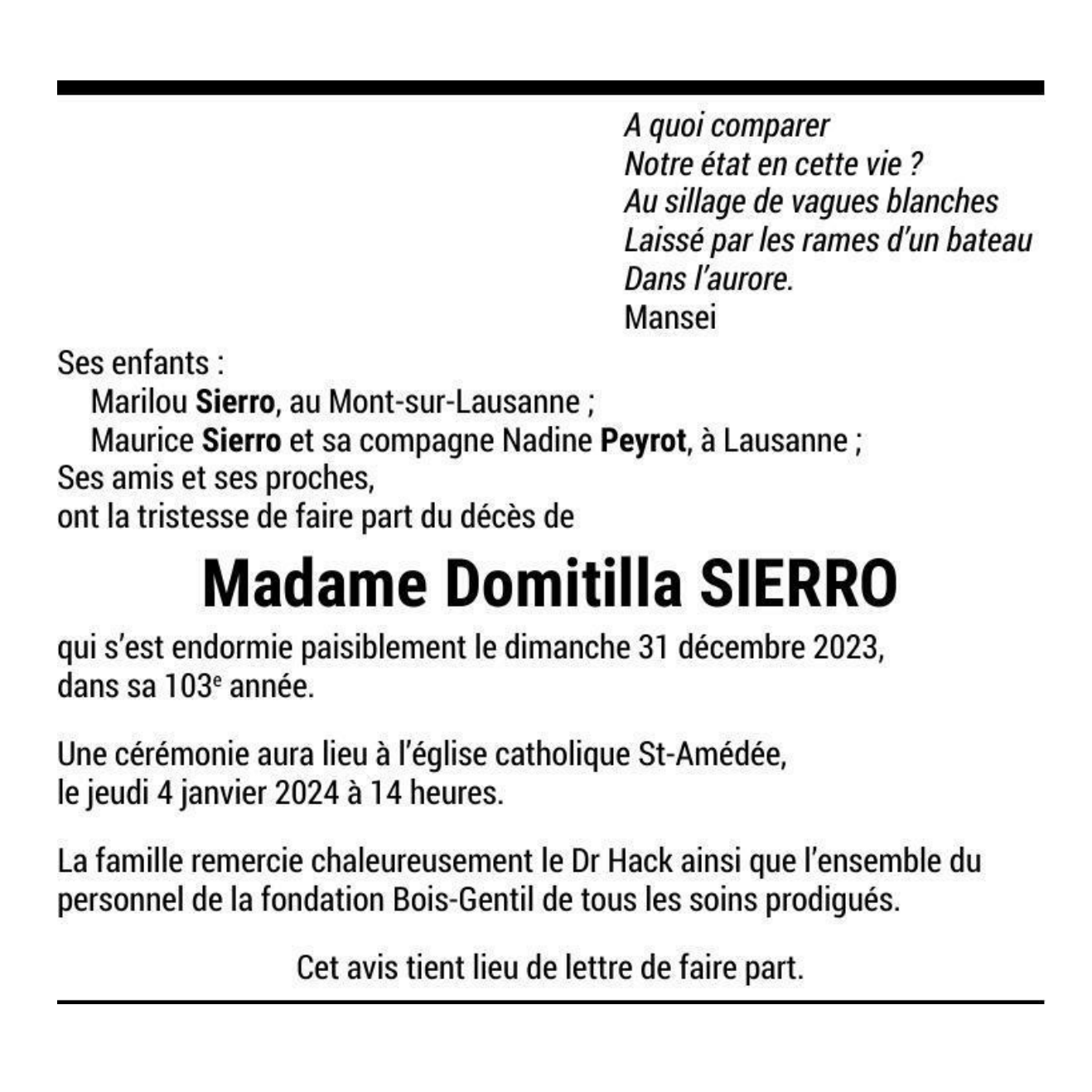 Madame Domitilla SIERRO 23 avr. 1921 - 31 déc. 2023 Avis mortuaire PFG Télecharger PDF Partager sur: Galerie PreviousNext PreviousNext