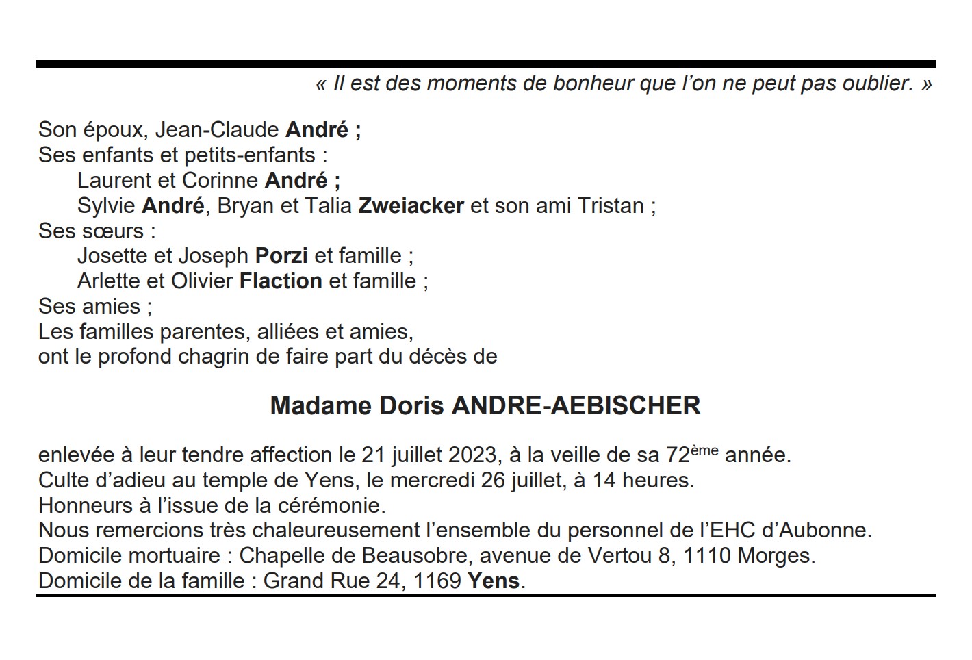 Madame Doris ANDRE-AEBISCHER 03 aoû. 1951 - 21 juil. 2023 Avis mortuaire PFG Télecharger PDF Partager sur: Galerie PreviousNext PreviousNext