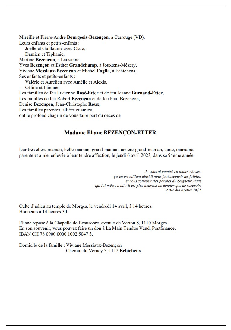 Madame Eliane BEZENÇON-ETTER 12 jan. 1930 - 06 avr. 2023 Avis mortuaire PFG Télecharger PDF Partager sur: Galerie PreviousNext PreviousNext