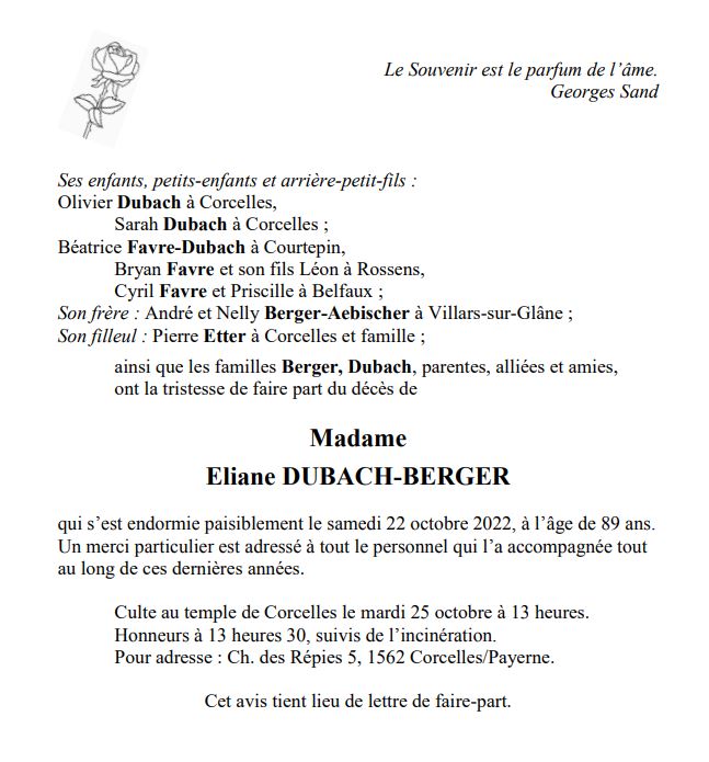 Madame Eliane DUBACH-BERGER 15 sep. 1933 - 22 oct. 2022 Avis mortuaire PFG Télecharger PDF Partager sur: Galerie PreviousNext PreviousNext