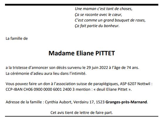 Madame Eliane PITTET 12 juin. 1948 - 29 juin. 2022 Avis mortuaire PFG Télecharger PDF Partager sur: Galerie