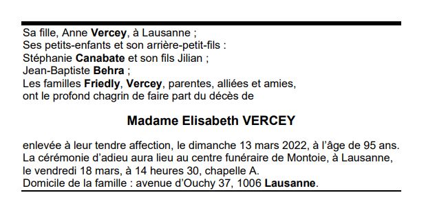 Madame Elisabeth VERCEY 24 avr. 1926 - 13 mar. 2022 Avis mortuaire PFG Télecharger PDF Partager sur: Galerie PreviousNext PreviousNext