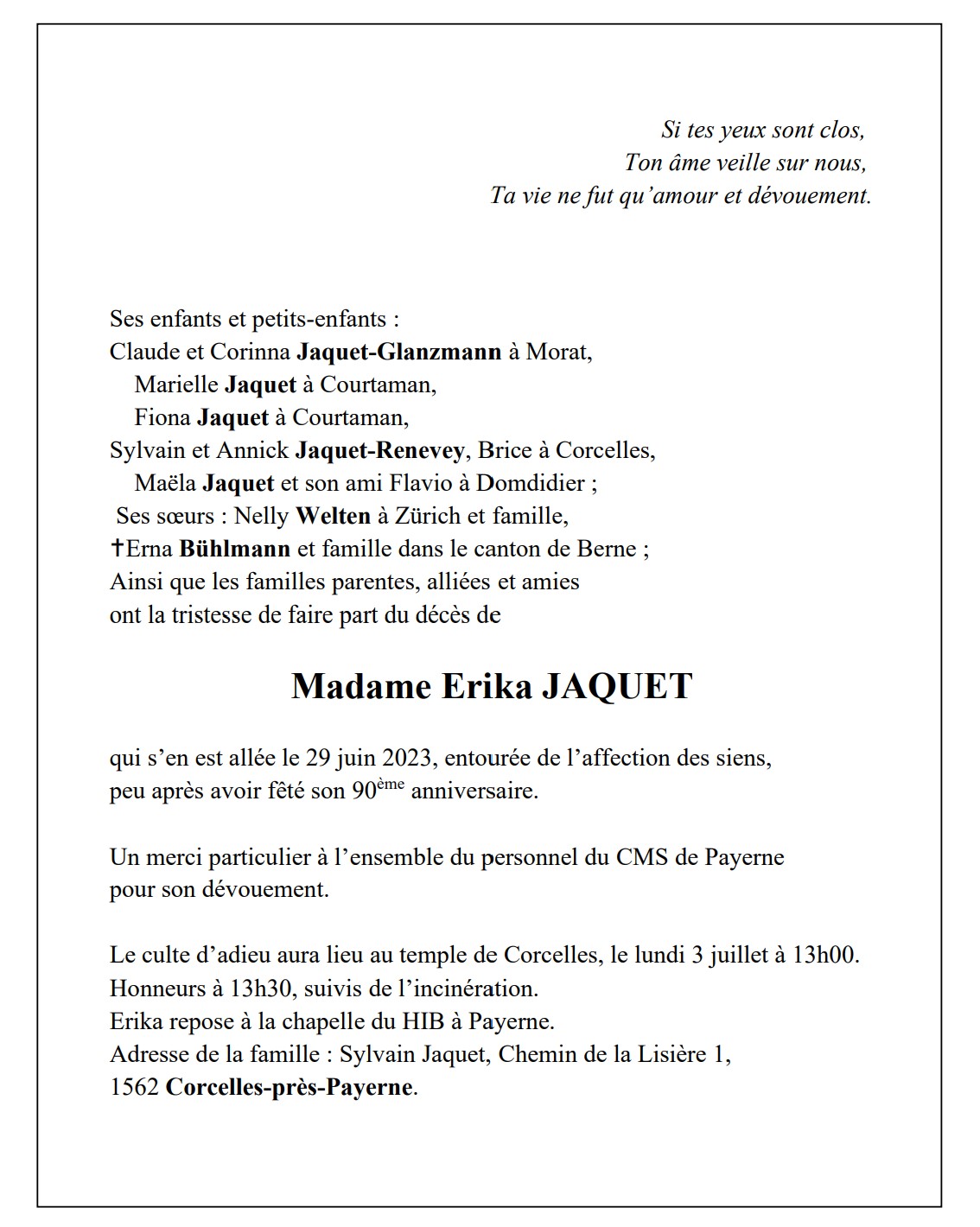 Madame Erika JAQUET 01 juin. 1933 - 29 juin. 2023 Avis mortuaire PFG Télecharger PDF Partager sur: Galerie PreviousNext PreviousNext