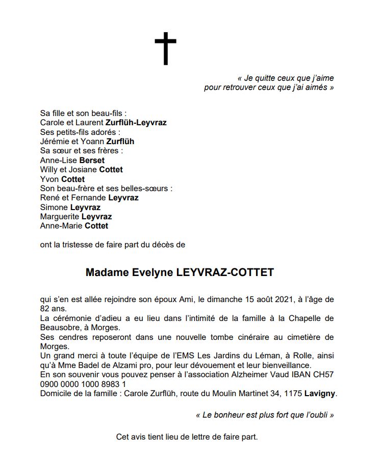 Madame Evelyne LEYVRAZ-COTTET 09 fév. 1939 - 15 aoû. 2021 Avis mortuaire PFG Télecharger PDF Partager sur: Galerie PreviousNext PreviousNext
