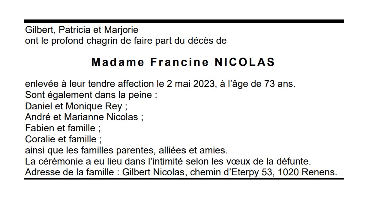 Madame Francine NICOLAS 17 fév. 1950 - 02 mai. 2023 Avis mortuaire PFG Télecharger PDF Partager sur: Galerie PreviousNext PreviousNext