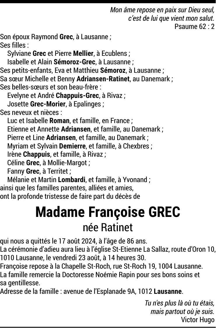 Madame Françoise GREC 24 avr. 1938 - 17 aoû. 2024 Avis mortuaire PFG Partager sur: Galerie PreviousNext PreviousNext