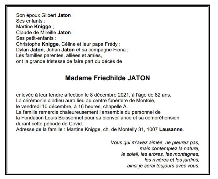 Madame Friedhilde JATON 27 nov. 1939 - 08 déc. 2021 Avis mortuaire PFG Télecharger PDF Partager sur: Galerie PreviousNext PreviousNext