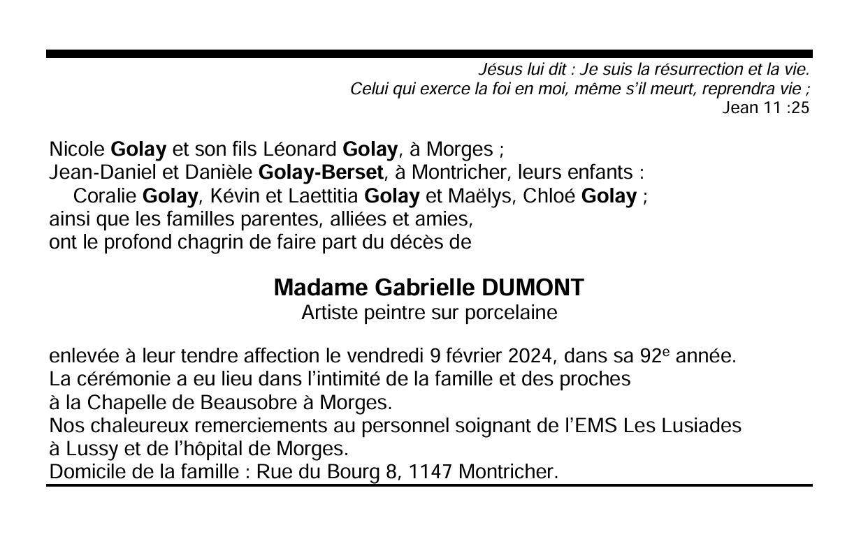 Madame Gabrielle DUMONT Artiste peintre sur porcelaine 02 oct. 1932 - 09 fév. 2024 Avis mortuaire PFG Télecharger PDF Partager sur: Galerie PreviousNext PreviousNext
