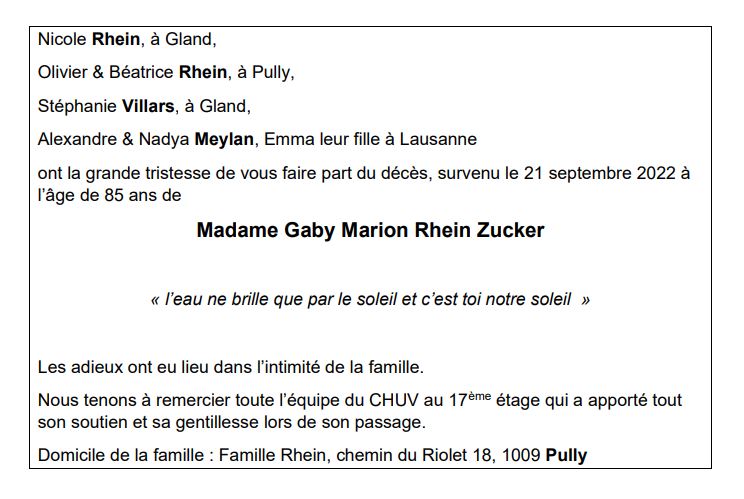 Madame Gaby Marion Rhein Zucker 22 juil. 1937 - 21 sep. 2022 Avis mortuaire PFG Télecharger PDF Partager sur: Galerie PreviousNext PreviousNext