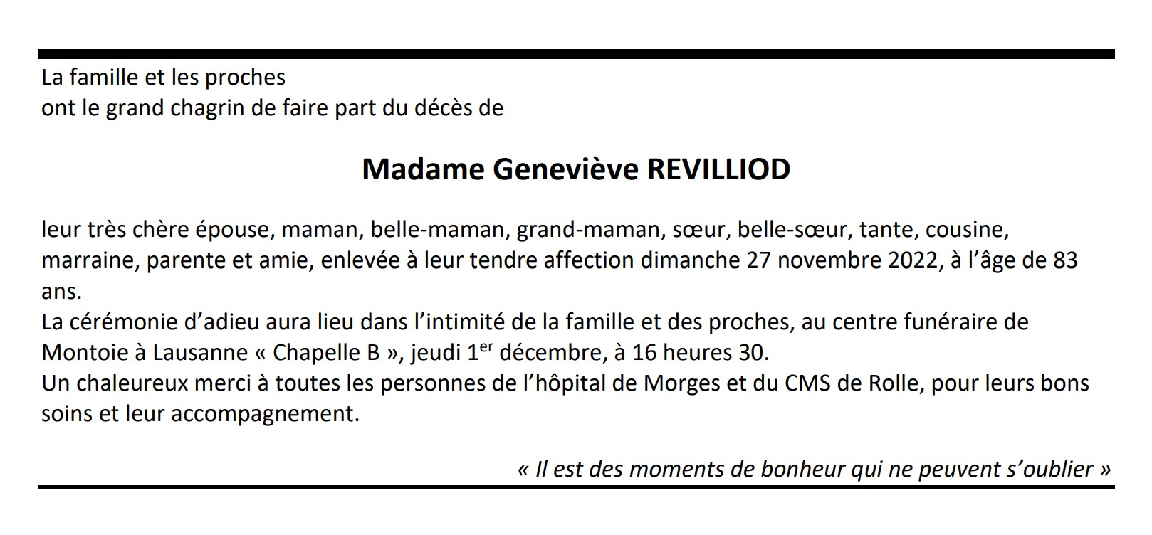 Madame Geneviève REVILLIOD 27 mai. 1939 - 27 nov. 2022 Avis mortuaire PFG Télecharger PDF Partager sur: Galerie PreviousNext PreviousNext