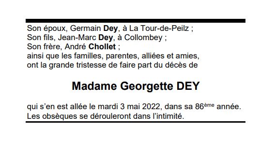 Madame Georgette DEY 04 oct. 1936 - 03 mai. 2022 Avis mortuaire PFG Télecharger PDF Partager sur: Galerie PreviousNext PreviousNext