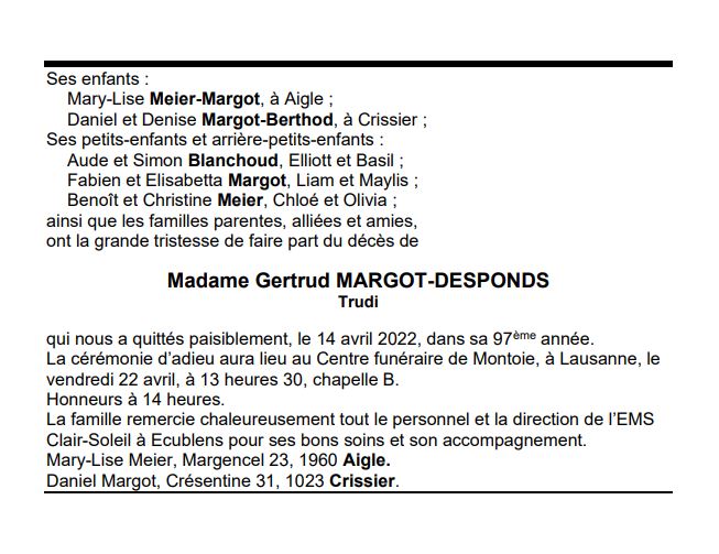 Madame Gertrud MARGOT-DESPONDS 04 sep. 1925 - 14 avr. 2022 Avis mortuaire PFG Télecharger PDF Partager sur: Galerie PreviousNext PreviousNext