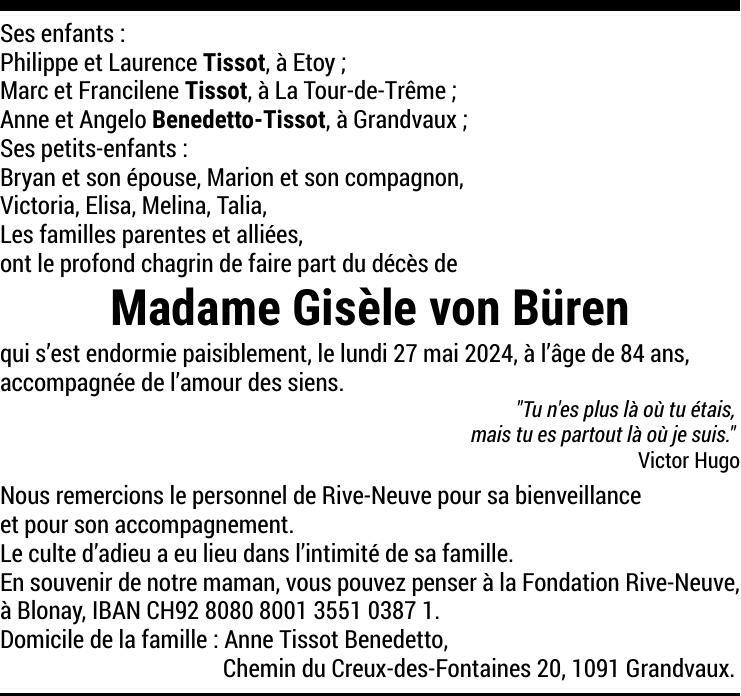 Madame Gisèle von BÜREN 18 jan. 1940 - 27 mai. 2024 Avis mortuaire PFG Télecharger PDF Partager sur: Galerie PreviousNext PreviousNext