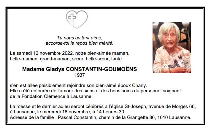 Madame Gladys CONSTANTIN-GOUMOËNS 14 fév. 1937 - 12 nov. 2022 Avis mortuaire PFG Télecharger PDF Partager sur: Galerie PreviousNext PreviousNext