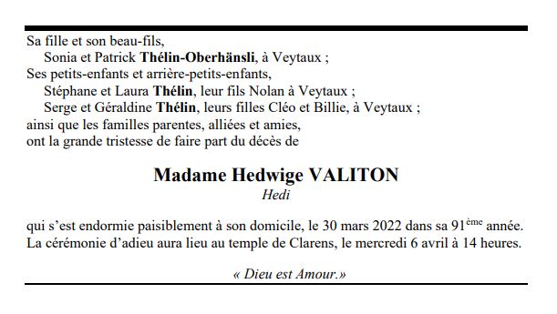 Madame Hedwige VALITON 13 juil. 1931 - 30 mar. 2022 Avis mortuaire PFG Télecharger PDF Partager sur: Galerie PreviousNext PreviousNext