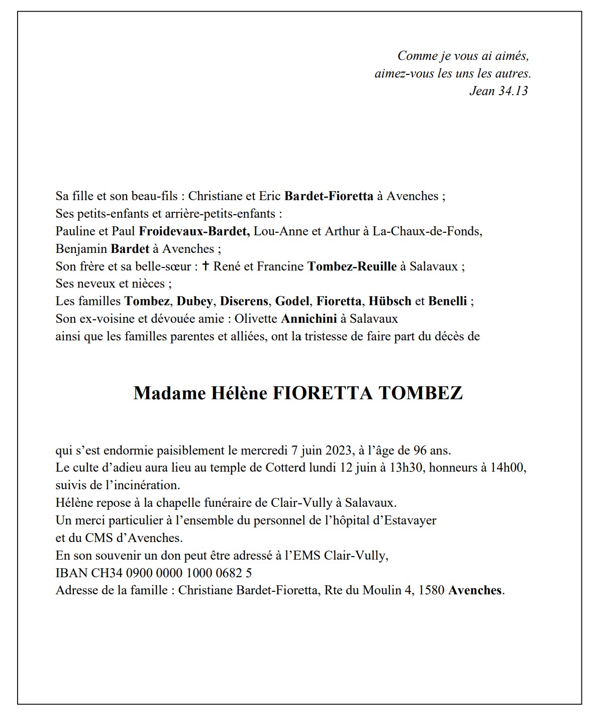 Madame Hélène FIORETTA TOMBEZ 22 mai. 1927 - 07 juin. 2023 Avis mortuaire PFG Télecharger PDF Partager sur: Galerie PreviousNext PreviousNext