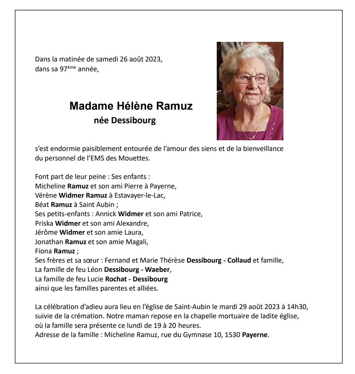 Madame Hélène Ramuz née Dessibourg 28 fév. 1927 - 28 aoû. 2023 Avis mortuaire PFG Télecharger PDF Partager sur: Galerie
