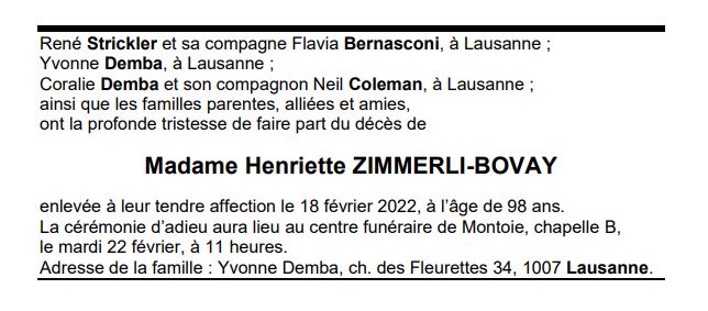 Madame Henriette ZIMMERLI-BOVAY 19 avr. 1923 - 18 fév. 2022 Avis mortuaire PFG Télecharger PDF Partager sur: Galerie PreviousNext PreviousNext