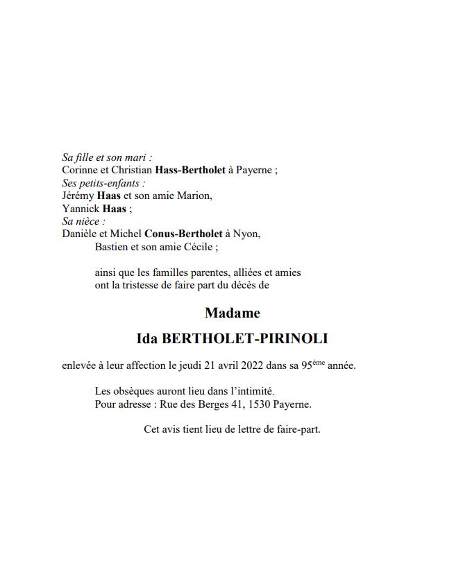 Madame Ida BERTHOLET-PIRINOLI 12 oct. 1927 - 21 avr. 2022 Avis mortuaire PFG Télecharger PDF Partager sur: Galerie PreviousNext PreviousNext