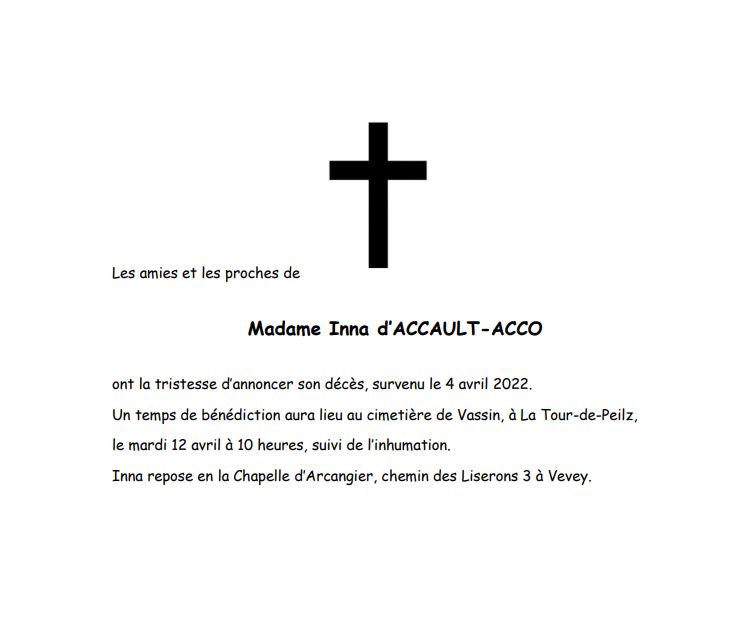 Madame Inna d’ACCAULT-ACCO 07 avr. 1930 - 04 avr. 2022 Avis mortuaire PFG Télecharger PDF Partager sur: Galerie PreviousNext PreviousNext