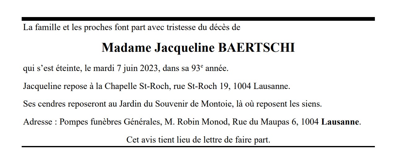 Madame Jacqueline BAERTSCHI 20 nov. 1931 - 06 juin. 2023 Avis mortuaire PFG Télecharger PDF Partager sur: Galerie PreviousNext PreviousNext
