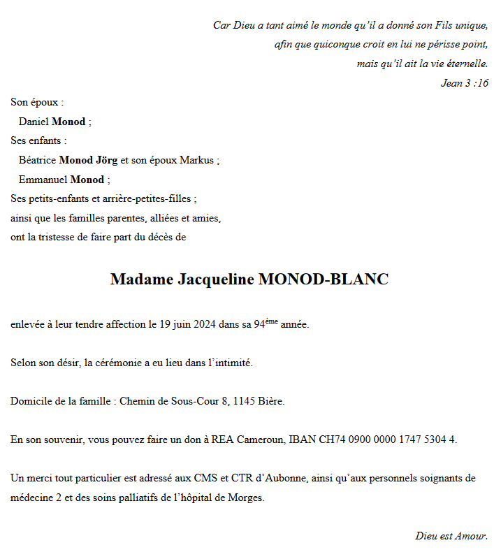Madame Jacqueline MONOD-BLANC 25 sep. 1930 - 19 juin. 2024 Avis mortuaire PFG Télecharger PDF Partager sur: Galerie