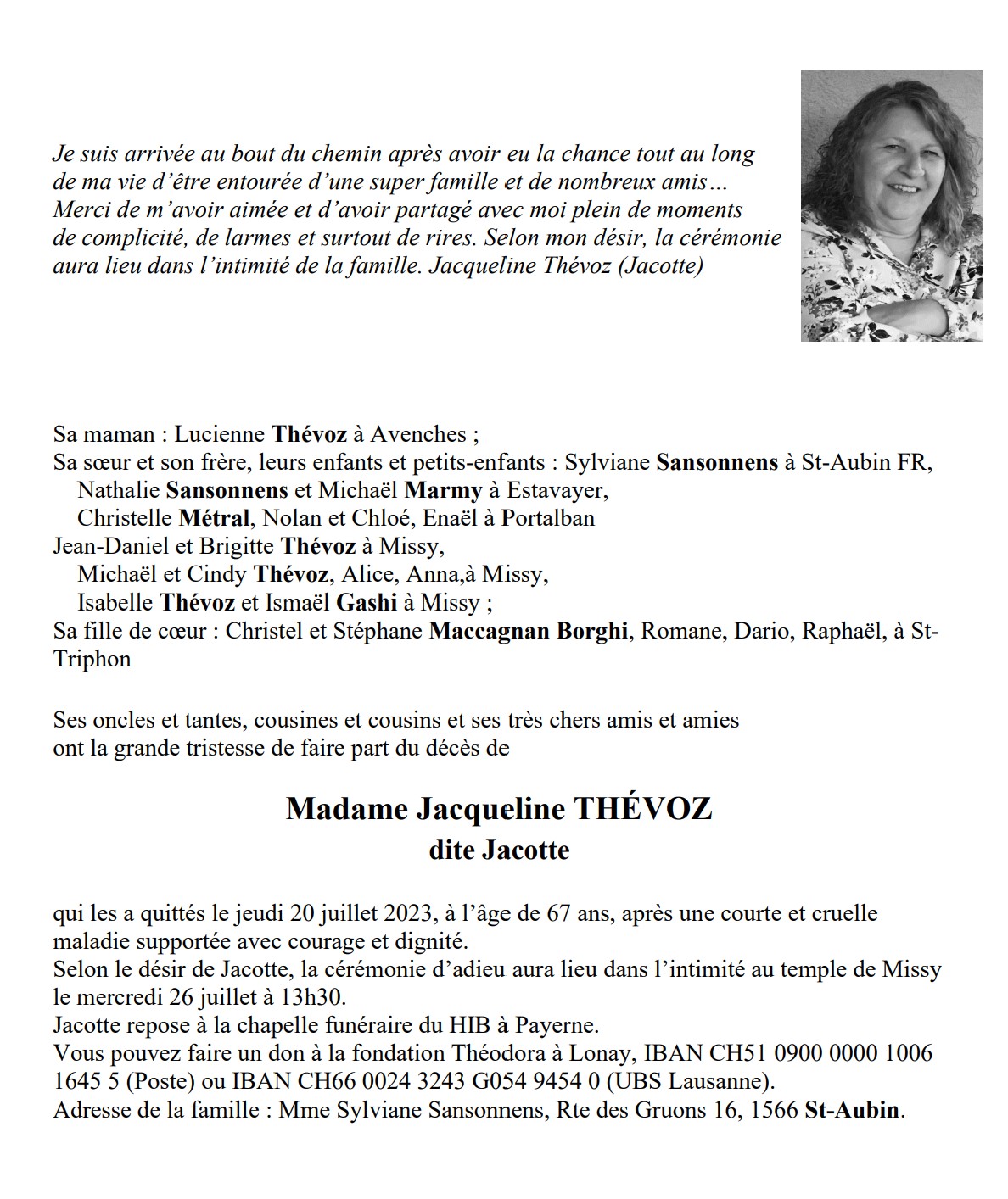 Madame Jacqueline THÉVOZ dite Jacotte 13 jan. 1956 - 20 juil. 2023 Avis mortuaire PFG Télecharger PDF Partager sur: Galerie PreviousNext PreviousNext