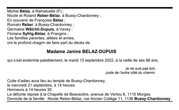Madame Janine BELAZ-DUPUIS 16 sep. 1934 - 13 sep. 2022 Avis mortuaire PFG Télecharger PDF Partager sur: Galerie PreviousNext PreviousNext
