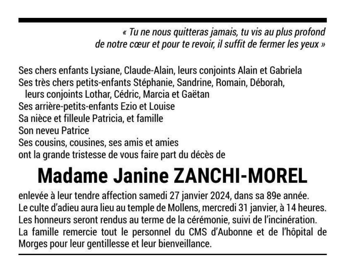 Madame Janine ZANCHI-MOREL 31 juil. 1935 - 27 jan. 2024 Avis mortuaire PFG Télecharger PDF Partager sur: Galerie PreviousNext PreviousNext