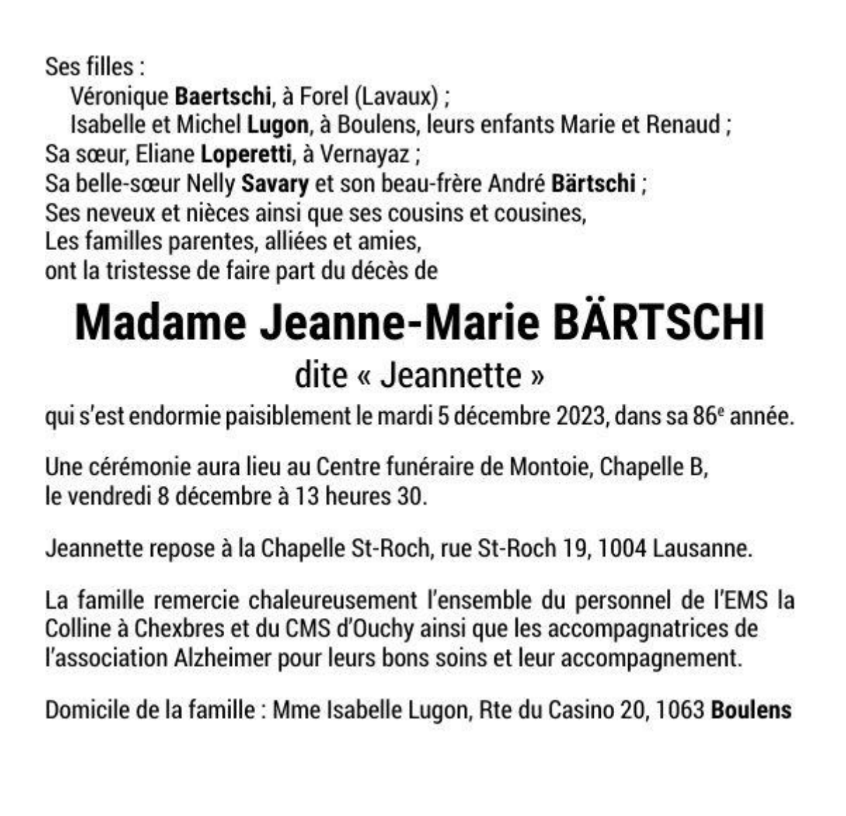 Madame Jeanne-Marie BÄRTCHI dite ≪ Jeannette≫ 20 mai. 1938 - 05 déc. 2023 Avis mortuaire PFG Télecharger PDF Partager sur: Galerie PreviousNext PreviousNext