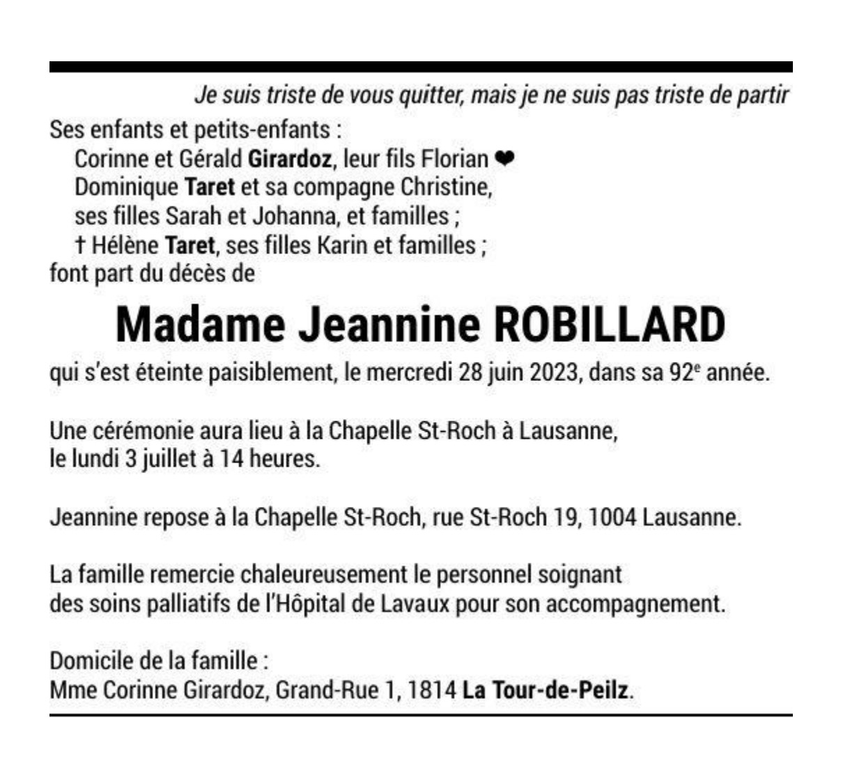 Madame Jeannine ROBILLARD 25 mai. 1932 - 28 juin. 2023 Avis mortuaire PFG Télecharger PDF Partager sur: Galerie PreviousNext PreviousNext