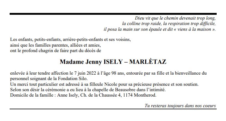 Madame Jenny ISELY – MARLÈTAZ 25 fév. 1924 - 07 juin. 2022 Avis mortuaire PFG Télecharger PDF Partager sur: Galerie PreviousNext PreviousNext