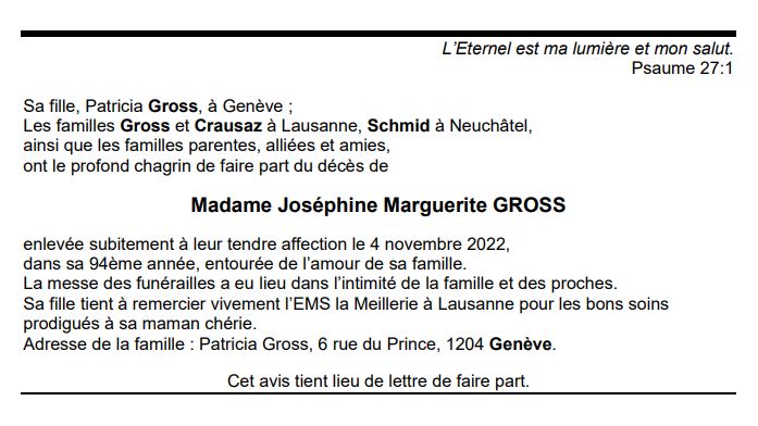 Madame Joséphine Marguerite GROSS 25 déc. 1928 - 04 nov. 2022 Avis mortuaire PFG Télecharger PDF Partager sur: Galerie PreviousNext PreviousNext