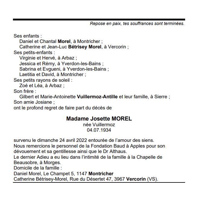 Madame Josette MOREL 04 juil. 1934 - 24 avr. 2022 Avis mortuaire PFG Télecharger PDF Partager sur: Galerie PreviousNext PreviousNext