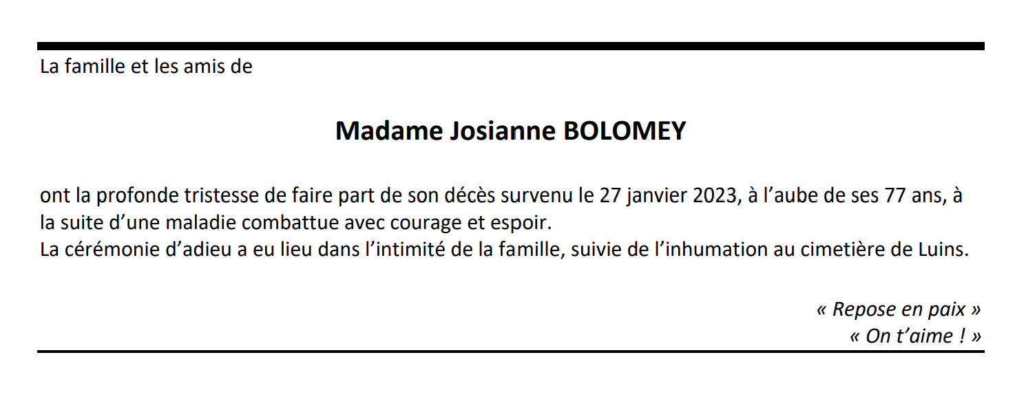 Madame Josianne BOLOMEY 12 mar. 1946 - 27 jan. 2023 Avis mortuaire PFG Télecharger PDF Partager sur: Galerie PreviousNext PreviousNext