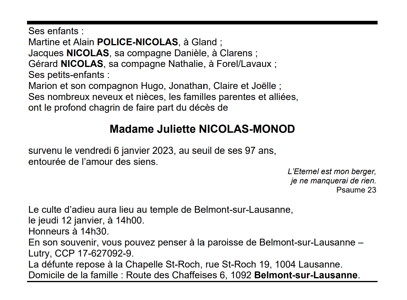 Madame Juliette NICOLAS-MONOD 17 fév. 1926 - 06 jan. 2023 Avis mortuaire PFG Télecharger PDF Partager sur: Galerie PreviousNext PreviousNext