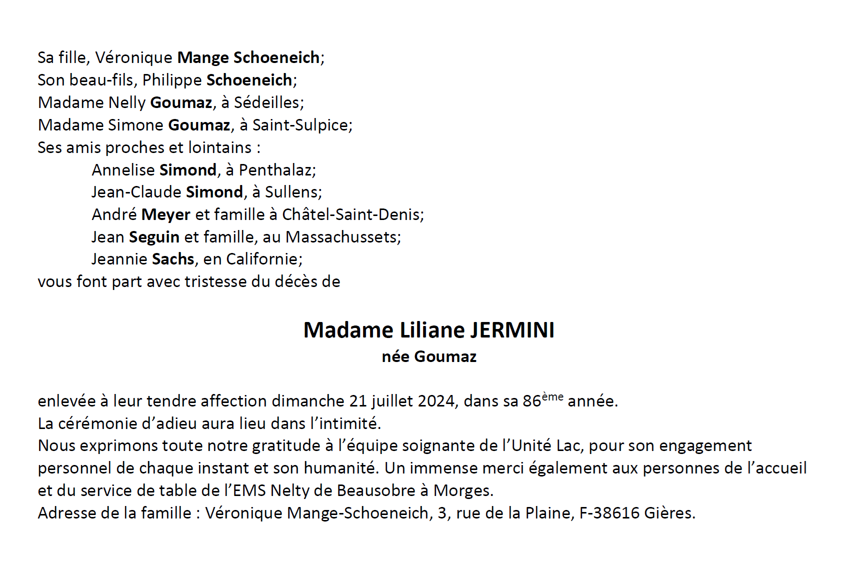 Madame Liliane JERMINI née Goumaz 19 oct. 1938 - 23 juil. 2024 Avis mortuaire PFG Télecharger PDF Partager sur: Galerie