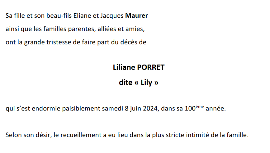 Madame Liliane PORRET 12 avr. 1925 - 08 juin. 2024 Avis mortuaire PFG Télecharger PDF Partager sur: Galerie