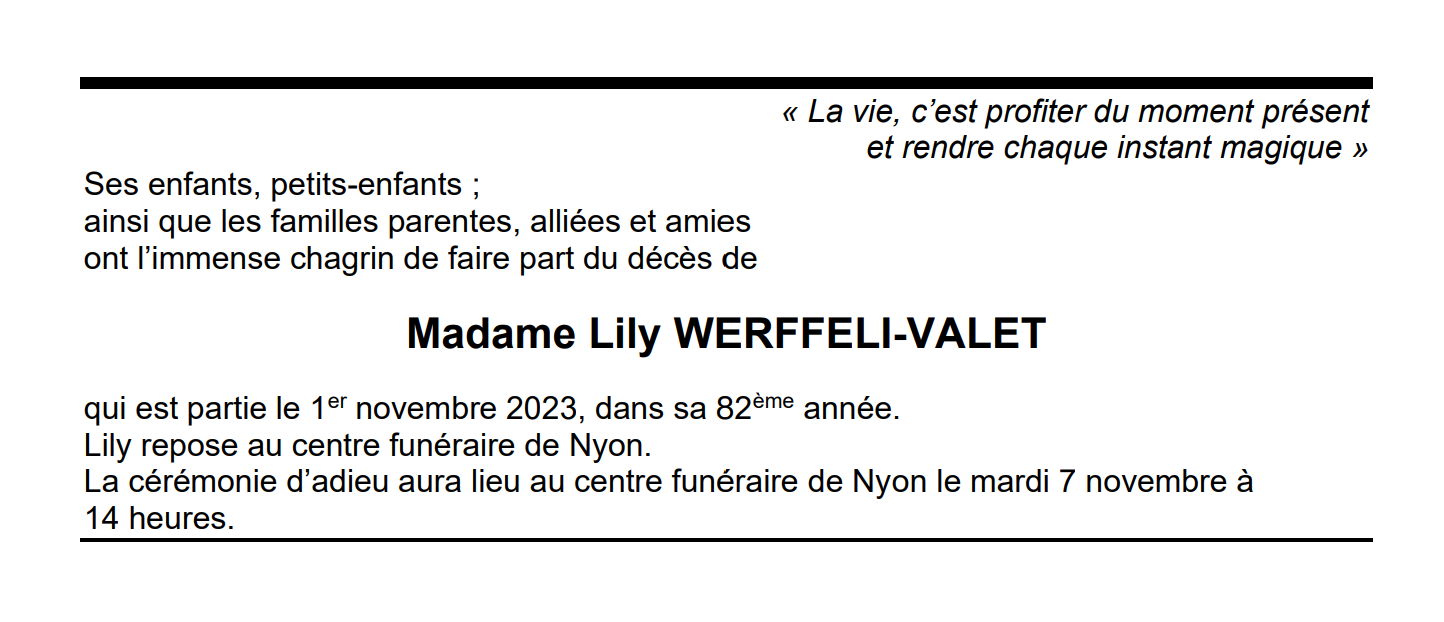 Madame Lily WERFFELI-VALET 16 nov. 9141 - 01 nov. 2023 Avis mortuaire PFG Télecharger PDF Partager sur: Galerie PreviousNext PreviousNext