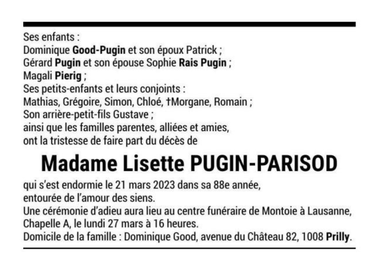 Madame Lisette PUGIN-PARISOD 18 nov. 1935 - 21 mar. 2023 Avis mortuaire PFG Télecharger PDF Partager sur: Galerie PreviousNext PreviousNext