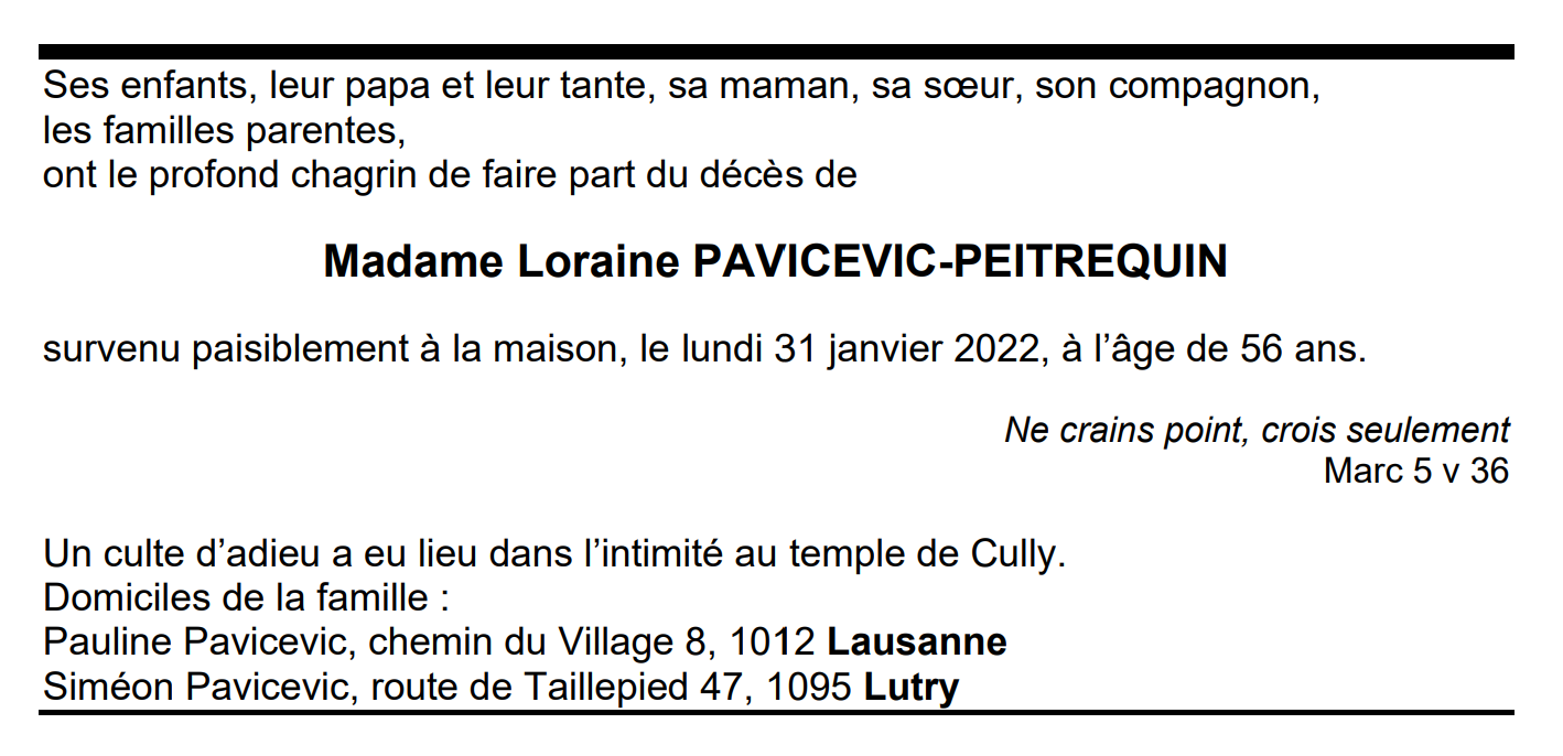 Madame Loraine PAVICEVIC-PEITREQUIN 06 juil. 1965 - 31 jan. 2022 Avis mortuaire PFG Télecharger PDF Partager sur: Galerie PreviousNext PreviousNext
