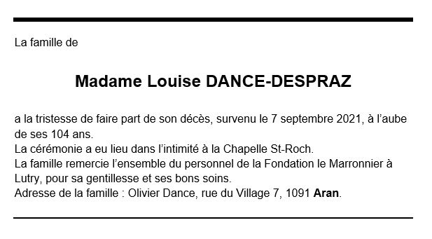 Madame Louise DANCE-DESPRAZ 30 oct. 1917 - 07 sep. 2021 Avis mortuaire PFG Télecharger PDF Partager sur: Galerie PreviousNext PreviousNext
