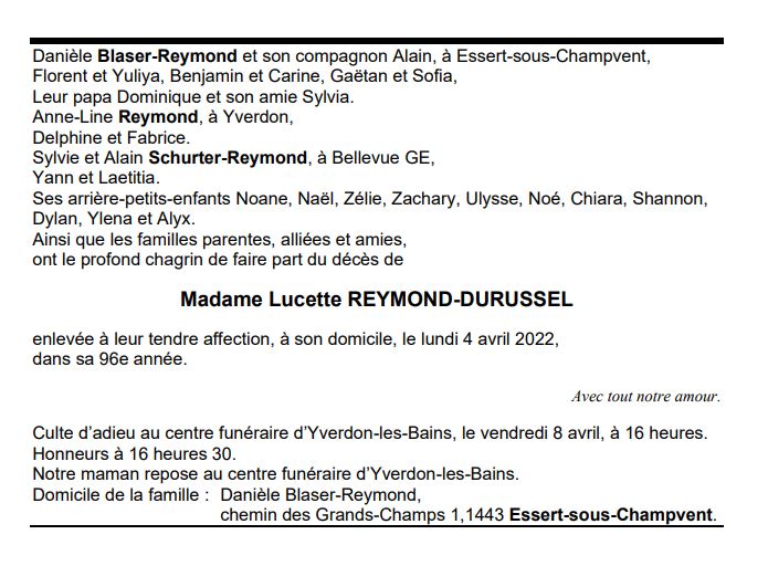 Madame Lucette REYMOND-DURUSSEL 23 juil. 1926 - 04 avr. 2022 Avis mortuaire PFG Télecharger PDF Partager sur: Galerie PreviousNext PreviousNext